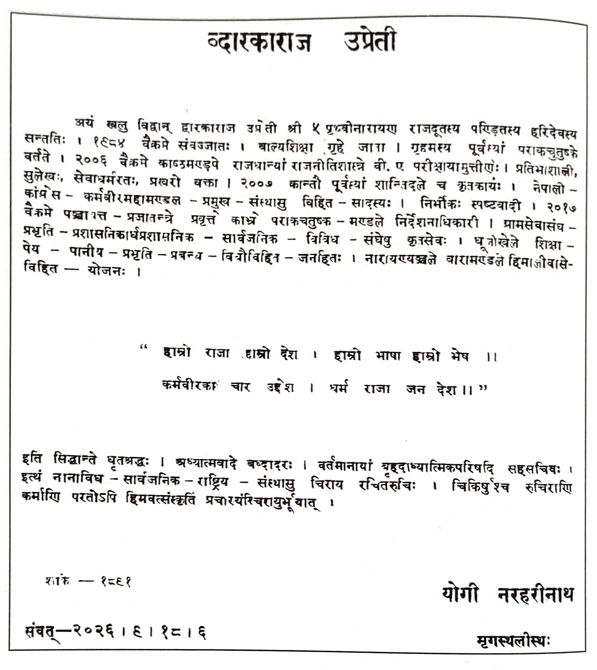 • १८०८ मा नुवाकोटबाट पृथ्वीनारायण शाहले पण्डित हरिदेव उप्रेतीलाई र पण्डित जमदग्नी उपाध्यायलाई लेखेको पत्र