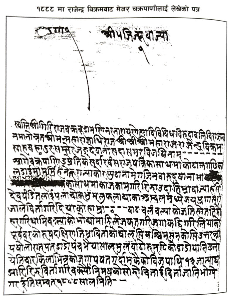 १८८८ मा राजेन्द्र विक्रमबाट मेजर चक्रपाणीलाई लेखेको पत्र